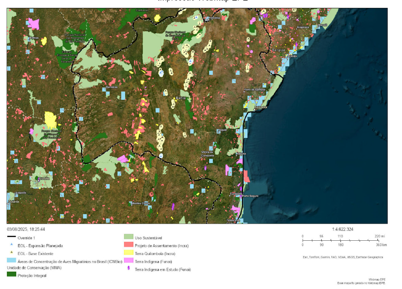 According to the article published by [1], among a series of data collected on the wind energy sector in the state of Bahia, Northeast Brazil, in 2023, one figure drew particular attention: 72.8% of the wind power capacity granted by the state was controlled by companies with foreign participation, with only 27 corporations controlling the 577 plants approved by ANEEL3[1]. Also points out that, as of 01/01/2024, 183,315.33 hectares of land had already been allocated by the state government for the exploitation of the wind energy market4. Although legitimized by the climate and environmental crises, as well as by the state and regional wind potential [2], the sector has, in recent years, revealed a series of contradictions inherent to the dynamics of this territorialization process within the state and the wider Northeast region. These contradictions have generated multiple socio-spatial impacts due to the installation of these projects. Among them, the presence of such structures in Brazilian traditional communities, such as Quilombola groups, Fundo and Fecho de Pasto communities, and different Indigenous peoples stands out, since it reproduces historical inequalities in land income distribution.