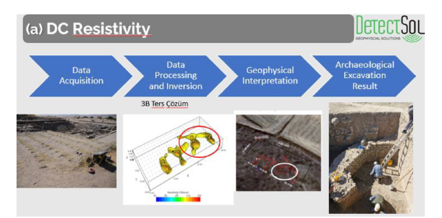 Figure 1:Workflow of DC resistivity in archaeogeophysical studies (adapted from [37]). The survey used a dipoledipole array with 1m electrode spacing along, totaling 280 electrodes arranged in 28 positions along x and 10 along y direction (taken web link [37]).