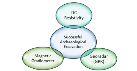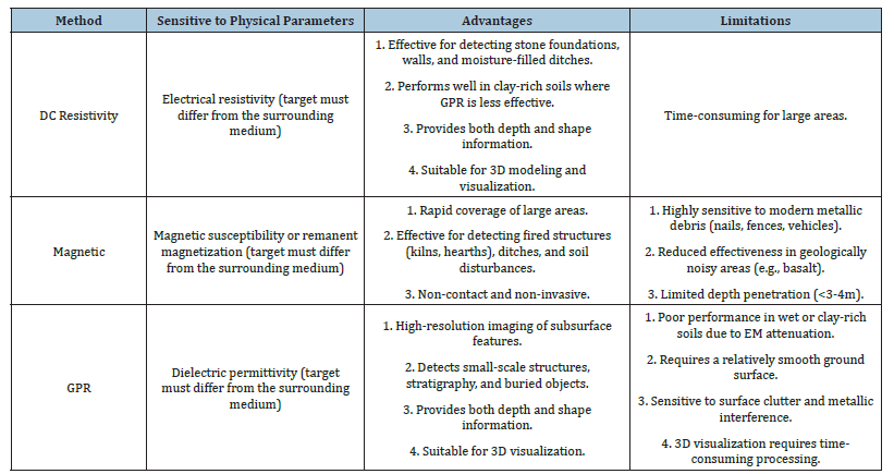 This review has outlined the principles, strengths, and limitations of three geophysical methods widely applied in archaeological investigations: DC resistivity, magnetic, and Ground-Penetrating Radar (GPR). Each method responds to different subsurface properties-electrical resistivity, magnetic susceptibility, and dielectric permittivity, respectively-resulting in varying effectiveness depending on site conditions. As summarized in the comparison table, all three methods are subject to specific environmental constraints and potential sources of noise that can compromise data quality [35-37]. Careful survey design, precise data acquisition, and rigorous data processing are essential to minimize these effects and to avoid misinterpreting noise as meaningful archaeological features. For this reason, archaeogeophysical surveys should be conducted and interpreted by experienced geophysicists or geophysical engineers, ensuring that results are both reliable and capable of providing effective guidance for archaeological excavation.