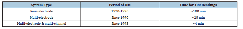 Data acquisition: Until the early 1990s, DC resistivity surveys used a four-electrode system, with manual repositioning of electrodes along the survey line. This was time-consuming, requiring ~180minutes for 100 readings. Advances in electronics and reduced component costs led to the development of multielectrode systems in the 1990s, which use more than 25 equally spaced electrodes connected via a multiplexed cable to a control unit. Computer-controlled switching enables automatic selection of electrodes for current injection and voltage measurement, reducing acquisition time for 100 readings to ~28minutes. From the mid- 1990s, multi-electrode, multi-channel systems (e.g., AGI SuperSting R8/IP, IRIS Syscal) were introduced, capable of recording voltages on 8-10 channels simultaneously. These systems can acquire 100 readings in ~4minutes, enabling rapid collection of high-density datasets suitable for 3D resistivity tomography (Table 1). Currently, archaeogeophysical surveys typically use sounding–profiling techniques along parallel survey lines to generate 3D resistivity models [11–14]. This approach allows efficient mapping of buried archaeological features.