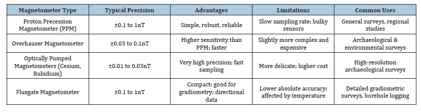 Table 2:Common magnetometer types and precision comparison used in archaeological surveys.