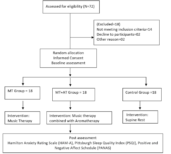 Another intervention, Music therapy is a technique of complementary medicine that uses music prescribed in a skilled manner by trained therapists to improve mental health and over-all wellbeing [15]. Listening to calm and slow tempo music in fluences the autonomic nervous system and the neuro-endocrine system which in turn reduces anxiety and facilitate relaxation by affecting the limbic system of the brain, which is responsible for controlling emotions [16]. Therefore, this study will become paring the effect of music therapy and music therapy combined with aromatherapy interventions which will be addressing test anxiety, improving cognitive functions, the quality of sleep and enhancing mood among students who experience anxiety, sleep disturbances, low mood and poor concentration prior to their exam.