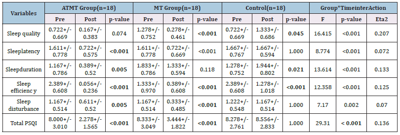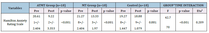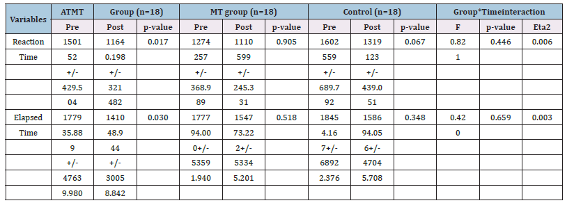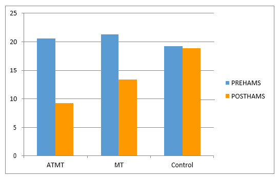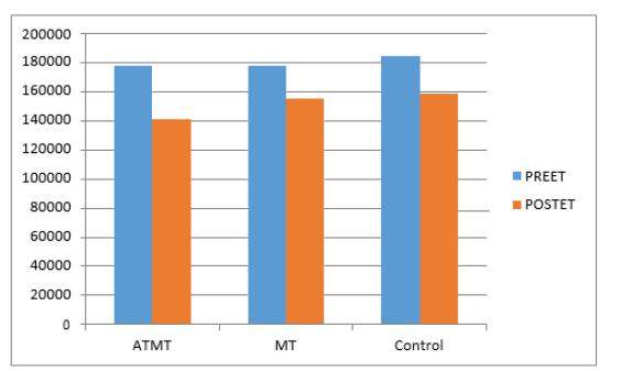 The pre-post data within each group was analyzed using repeated ANOVA. There was a significant difference in ATMT group and MT group. However, ATMT showed significant difference when compared to MT group.