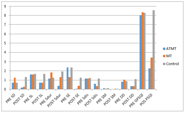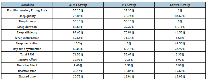 All three groups (ATMT, MT and control group) were assessed before and after the intervention using Hamilton Anxiety Rating Scale (HAM-S), Pittsburgh Sleep Quality Index (PSQI), The Positive and Negative Affect Schedule (PANAS) and Stroop Task. At the end of the study ATMT (P<0.001) and MT (P<0.001) group demonstrated the significant reduction in Anxiety as compared to control group (Table 1). But ATMT group showed (Figure 2) higher percentage changes (55.25%) of reduction in anxiety than MT group (37.33%). (Table 2). The pre and post intervention value of Stroop task shown in (Table 3). There was Significant reduction of the reaction time (P=0.017) and elapsed time (P=0.03) found in ATMT group as compared to MT and Control group. Results also show significant changes in different domains of Sleep quality in (Table 4). ATMT group showed significant improvement in sleep latency (P<0.001), sleep duration (P=0.005), Sleep efficiency (P<0.001), sleep disturbance (P=0.005) and total sleep quality index (P<0.001). The MT group showed significant improvement in sleep quality (P<0.001), sleep latency (P<0.001), sleep efficiency (P<0.001), sleep disturbance (P=0.005), and total sleep quality index (P<0.001). The control group showed significant improvement in sleep quality (P= 0.045), sleep duration (P=0.021) and sleep efficiency (P<0.001). Percentage of changes in different domains of Sleep quality shown in figure (Figure 3) After the study the higher percentage of changes found in positive and negative affectivity in ATMT group as compared to MT and control group (Figure 4) but it was not found statistically significant in all groups (Table 2).