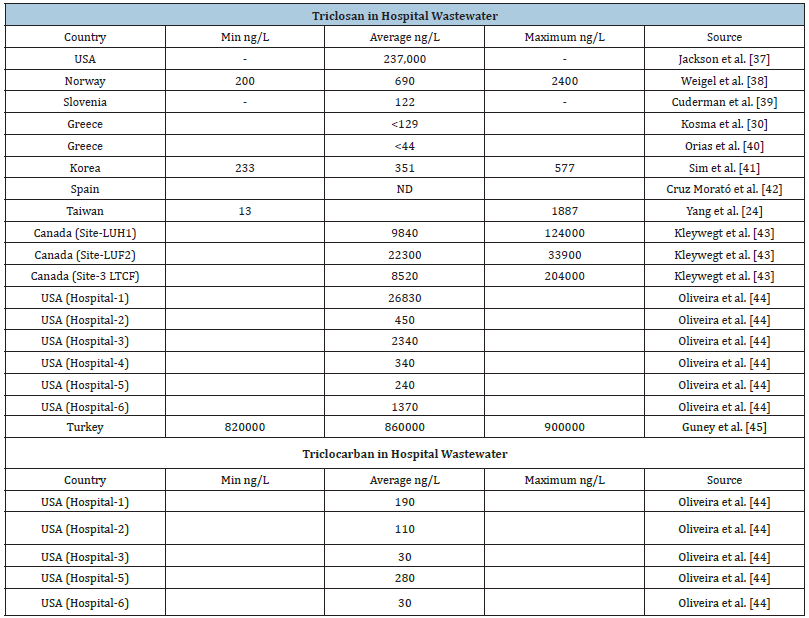 Scientific Committee on Consumer Safety [35] reports that TCS has been effectively used clinically to eradicate micro-organisms such as methicillin-resistant Staphylococcus aureus (MRSA), notably with the recommendation to use 2% TCS bath. TCS is employed as surgical scrubs, and widely used in hand and body washing to eradicate MRSA prior to surgery. TCS is used in many medical devices, including ureteral stents, surgical sutures and might be considered to prevent graft infection. Occupational sources represent a potentially important exposure scenario because some, albeit not all, healthcare institutions commonly use TCScontaining antibacterial soaps and because frequent handwashing among healthcare workers in such environments (range 0.7-30 times per hour) is likely to facilitate TCS exposure [36]. Reported concentrations of TCS and TCC in hospital wastewater are presented in Table 1.