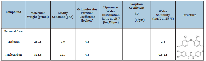 This research investigated sources of TCS and TCC into the sewer system, to provide insights into the magnitudes of these emerging contaminants. Three different municipalities were involved in the monitoring efforts and will be referred to as cities A, B, and C. Table 2 presents TCS and TCC physical and chemical properties