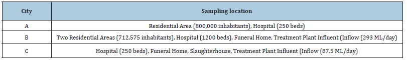 Samples were taken from manholes directly downstream of hospitals, funeral homes, residential neighborhoods and a slaughterhouse by municipal staff for the three cities. Due to the batch process of embalming a body, grab samples were used for both funeral homes and coordinated with the funeral home staff to ensure that the sample was taken during a time when there was an embalming occurring. At each location, three liters of sample was collected and split into two amber glass bottles and one HDPE bottle before they were stored at 4 °C until analysis. Analytical work was completed at the Worsfold Water Quality Centre at Trent University. The following table outlines the sampling locations within each city.