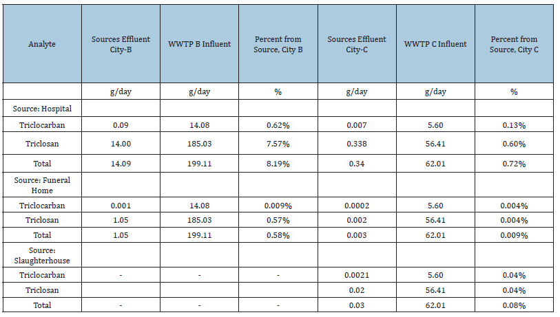 Kleywegt et al. [43] estimated the percent contribution of TCS from hospitals to total loading of grams/day to the receiving WWTP as 5.9%. Ort et al. [38] estimated the percentages of TCS from hospitals to the WWTP as 6%.