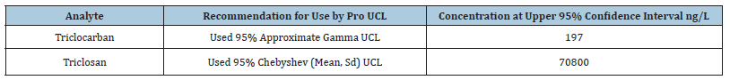 It was hypothesized that some of the concentrations of TCS percentages of loads for some of the chemical compounds are very high because of the outliers in the data. USEPA ProUCL Ver 4.1 was used where the Dixon test was used to test for a single outlier in a univariate data set since the number of samples were around 5 [53]. This test is primarily used for small data sets (Data plot limits the sample to be between 3 and 30). It can be used to test whether the minimum value is an outlier, the maximum value is an outlier, or either the minimum or maximum value is an outlier. The following outliers were identified: concentration of 860,000ng/L of TCS was identified as an outlier, and hence removed from the data. The upper confidence limits (UCL) for the means were completed by using the appropriate distributions are listed in Table 5.