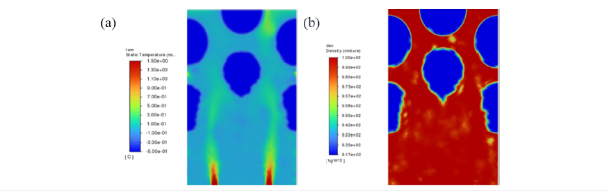 Figure 2:Ice melt: (a) Temperature cloud map; (b) Density cloud map (t=1.04 s).