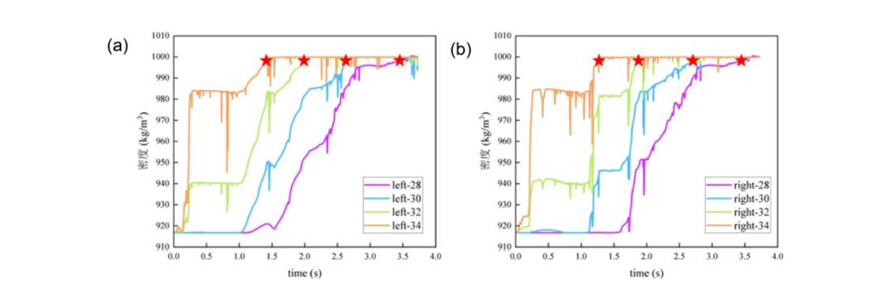 Figure 3:Density curve diagram of ice melting process simulation: (a) Schematic diagram of density monitoring points; (b) Monitoring of ice layer on the left side of the coil; (c) Monitoring of ice layer on the right side of the coil (nozzle diameter 14mm, nozzle spacing 100mm, initial water velocity 10m/s) (stars in the figure indicate ice melted into water).