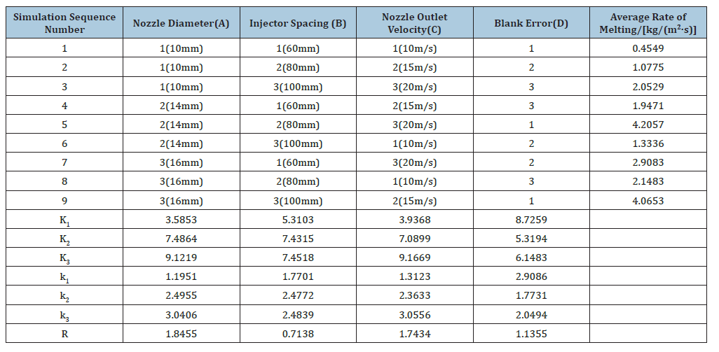 Through orthogonal simulation and range analysis, the primary and secondary order of influence of three key water distribution parameters nozzle diameter, outlet velocity, and nozzle spacing on average ice-melting rate was determined as: nozzle diameter> outlet velocity> nozzle spacing. This sequence indicates that in the study system, the initial momentum carried by the jet (primarily determined by diameter and velocity) is the dominant factor in ice-melting effects, with greater influence than nozzle distribution density. Comprehensive analysis yielded the optimal parameter combination for maximizing average icemelting rate: nozzle diameter 16mm, spacing 100mm and outlet velocity 20m/s. Under these optimized conditions, the simulated average ice-melting rate reached approximately 4-5kg/(m²·s), achieving significant improvement compared to undisturbed or low-efficiency disturbance conditions. This technical solution fundamentally eliminates metal corrosion risks caused by dissolved oxygen introduced through air injection, while avoiding energy consumption and thermal pollution associated with compressed air systems, thereby enhancing overall system efficiency. Additionally, the optimized jet can form a more uniform and intensified flow field, effectively preventing the formation of localized “millennium ice,” improving cold storage release efficiency and system operational reliability (Table 1).