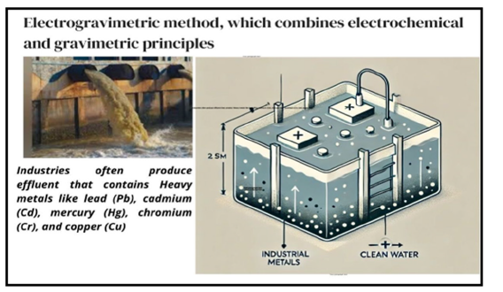 Heavy metals, a byproduct of industrial activities, have become a pervasive environmental pollutant, posing severe risks to Human Health [1], Ecosystems [2], and the Economy [3]. Industrial effluents contaminated with toxic heavy metals such as lead, cadmium, chromium, copper, nickel, zinc, and mercury, are released into water bodies, soil, and air, causing irreversible damage [4]. The consequences of heavy metal pollution are far-reaching and multifaceted. Human health is compromised through increased risk of Cancer [5], neurological damage [6], Kidney Dysfunction [7], and reproductive issues [8]. Environmental degradation occurs as heavy metals accumulate in ecosystems, harming aquatic life, contaminating food chains, and altering ecosystem dynamics [9]. Furthermore, heavy metal pollution has significant economic impacts, affecting agriculture, fisheries, and tourism [10]. Traditional treatment methods, including chemical precipitation, adsorption, and membrane filtration, often struggle to effectively remove heavy metals from industrial effluents due to limitations in efficiency, high operational costs, generation of secondary pollutants, and inability to target specific heavy metals [11]. In response, electrogravimetric technique, or electrochemical precipitation, has emerged as a promising solution [12]. This innovative approach leverages electrical energy to precipitate heavy metals, offering numerous advantages, including high removal efficiency, selectivity for specific heavy metals, energy efficiency, compact design, and costeffectiveness [13]. This review provides a comprehensive evaluation of electrogravimetric technique for heavy metal removal from industrial effluents. The discussion encompasses the principles, advantages, and parameters influencing its performance, as well as applications in various industrial settings, to assess its effectiveness and potential for widespread adoption (Figure 1).