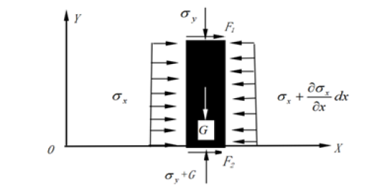 In Equation (7), σb1 is the compressive stress at the coal wall of the roadway (MPa), b1 is a coefficient describing the stress variation rate (m⁻¹), and x is the depth from the coal wall (m). G is the selfweight stress of the analyzed coal body (MPa); F₁ is the frictional resistance between the coal seam and roof (rolling friction, MPa); F₂ is the frictional resistance between the coal seam and floor (sliding friction, MPa); σ x is the stress parallel to the impact direction, which is correlated with σ y .