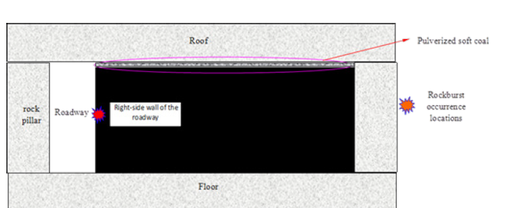 Figure 2 is the design diagram of the specific seismic ground pressure numerical simulation plan. The location of seismic ground pressure occurs on the right side of the roadway, which is a largescale solid coal mass. Seismic ground pressure typically occurs in areas with hard and thick surrounding rock, and there is a thin layer of powdery soft coal (approximately 0.1 to 0.2m thick) between the roof and the coal seam. Therefore, hard roof and floor slabs are set below and above the coal body, and weak coal is placed between the coal seam and the roof.