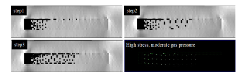Similarly, by adjusting the model’s stress and gas pressure parameters, the evolution of coal fracturing and gas flow distribution during rockburst development under moderate stress and high gas pressure conditions can be obtained, as shown in Figure 5.