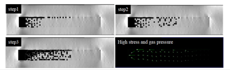 Figure 5:Evolution of coal body rupture under high stress and moderate gas pressure.
