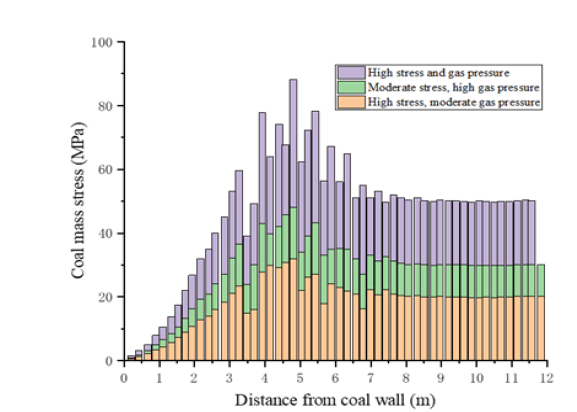 Eventually, the coal body is impacted and ejected under the combined effect of residual elastic strain energy and gas pressure. According to the numerical simulation results, under high stress and gas pressure conditions, the initial rupture of soft coal is relatively violent, and the distance between black damage units is small. Moreover, under the instant release of high-pressure gas in the deep coal body, the powdered coal is carried away by highpressure airflow, which inevitably causes the stress transfer in the overlying strata to be borne by the smaller, harder coal particles. At this point, the stress distribution under different conditions is shown in Figure 7.