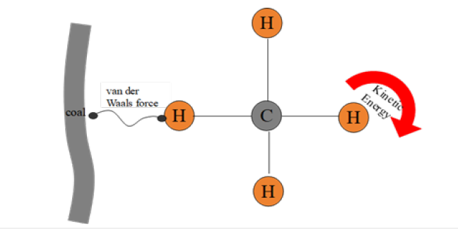 When the temperature of the coal-gas system rises, the random motion of gas molecules intensifies, increasing collision strength and frequency. This raises the kinetic energy of adsorbed gas molecules, shortens their residence time on the coal surface, and reduces overall gas adsorption. In summary, adsorbed gas molecules are subjected to van der Waals forces from the coal pore surface while simultaneously undergoing random motion with a certain amount of kinetic energy. However, this energy is usually insufficient to overcome the van der Waals force, as illustrated in Figure 8.