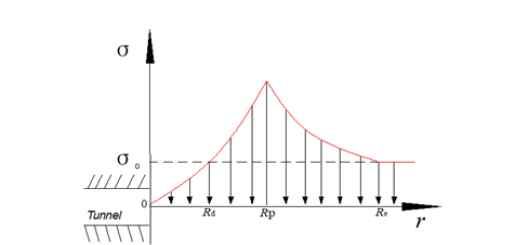 Within the range of 0 to Rp, the stress ahead of the excavation face can be expressed by Equation (5).