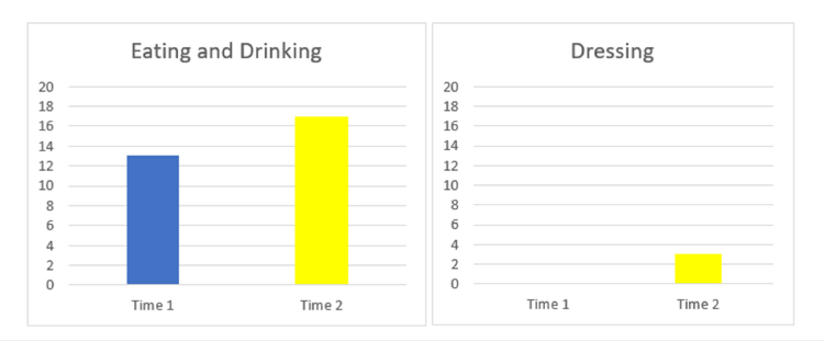 Figure 1:Raw scores (from 0 to 20) in «Eating and Drinking» and «Dressing» categories in VABS-II obtained by the senior with ASD and severe ID at Times 1 and 2 (duration=24 months), and category’ maximum score (=20).