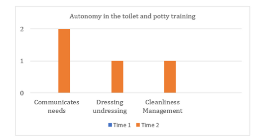 Figure 2:Scores (0, 1 or 2) of the behaviors exhibited by the senior with ASD and severe ID in Communication Needs, dressing undressing and Cleanliness Management assessed with the Observation Grid for Autonomous Scale (OGAS) at Times 1 and 2 (Interval duration=24 months).