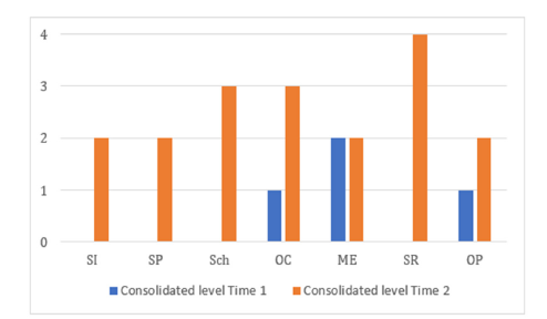 Figure 3:Profiles of consolidated development levels at Times 1 and 2 for the cognitive domains: Self-Image (SI), Symbolic Play (SP), Object Relation schemata (Sch), Operational Causality (OC), Means-End (ME), Spatial Relations (SR), and Object Permanence (OP).
