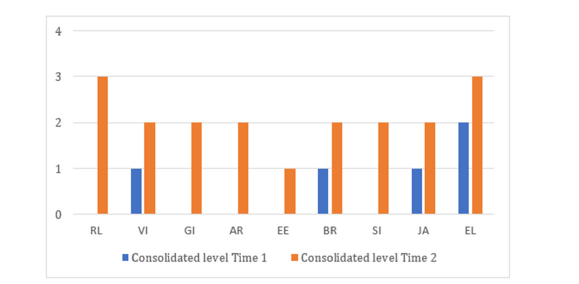 Figure 4:Profiles of consolidated development levels at Times 1 and 2 for the socio-emotional domains: Receptive Language (RL), Vocal Imitation (VI), Gestural Imitation (GI), Affective Relation (AR), Emotional Expression (E), Behaviour Regulation (BR), Social Interaction (SI), Joint Attention (JA), Expressive Language (EL). Increase was particularly noted in Receptive Language (RL).