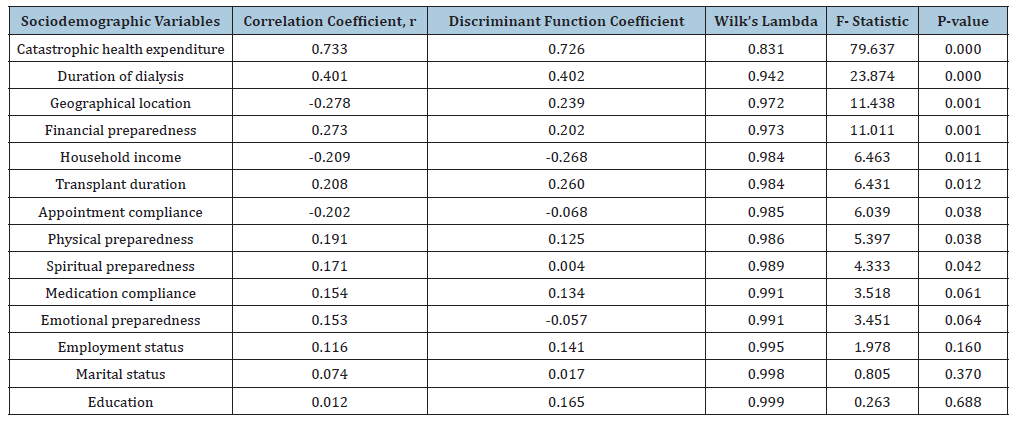 To identify the most responsible variable in choosing a hospital, discriminant analysis was done. The variables included in discriminant analysis were geographical location, marital status, education, employment status, household income, catastrophic health expenditure, financial preparedness, appointment compliance, medication compliance, physical preparedness, spiritual preparedness, emotional preparedness, duration of dialysis, and duration of transplantation. The initial result of the analysis indicated that the two groups of transplant recipients treated in two health care providers were significantly different [X2 Wilk’s Lamda=0.725, X2 = 123.377, p-value=0.000].