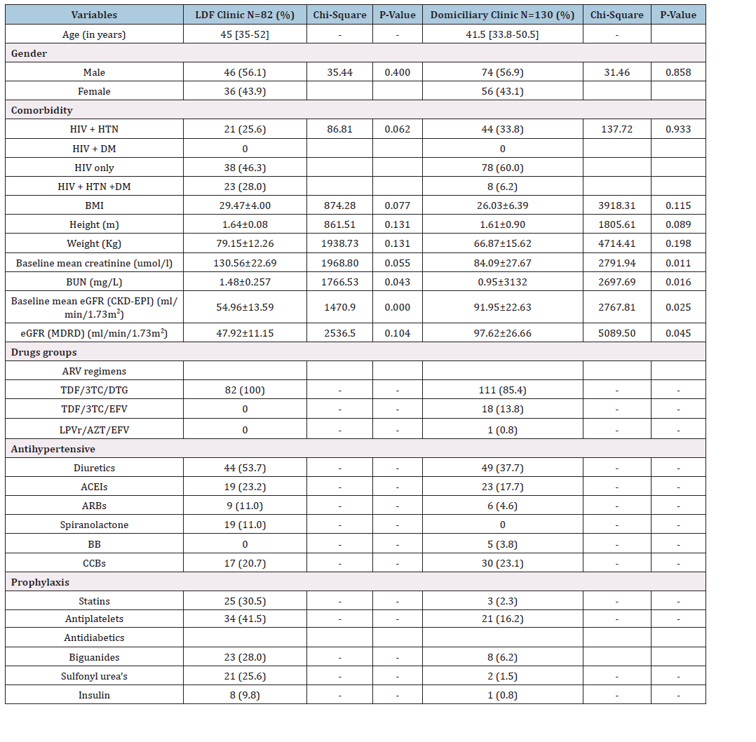 A total of 212 medical records were analysed, comprising 82 from the LDF clinic and 130 from the Domiciliary clinic. Among LDF records, 43.9% (n = 36) were females, and 56.1% (n=46) were males. In the Domiciliary Clinic, 56.9% (n=74) were females, while 43.1% (n=56) were males. The median age was 45.00 years [interquartile range (IQR) 35.00-52.00] at the LDF clinic, whereas at the Domiciliary clinic, the median 41.50 [interquartile range (IQR) 33.75-50.50]. At the LDF clinic, 48.3% (n= 38) had HIV only, 25.6% (n=21) had both HIV and HTN, whereas 28.0% (n=23) had HIV, HTN and DM (p=0.062). At Domiciliary, 60.0% (n=78) had HIV, 33.8% (n=44) had HTN and HIV, while the ones with HIV, HTN and DM were 6.2% (n=8), (p=0.933) (Table 1). The mean BMI for patients were (29.47 ± 4.00kg/m2, p=0.077) at the LDF clinic and (26.03±6.39kg/m2, p=0.115) at the Domiciliary clinic (Table 1). At the LDF clinic, the baseline average mean serum creatinine was 130.56±22.69umol/l, results were independent of age (p=0.055), whereas at the Domiciliary clinic, the baseline average mean serum creatinine was 84.09±27.67umol/l, and results significantly depend on age (p=0.011) (Table 1). The baseline average mean eGFR based on CKD-EPI was 54.96±13.59ml/min/1.73m2, and results significantly depend on age p<0.000), whereas for MDRD the baseline average mean was 47.92±11.15ml/min/1.73m2 (p=0.104) (Table 1). At the Domiciliary clinic, the baseline average mean eGFR based on CKD-EPI was 91.95±22.63ml/min/1.73m2 and results significantly depend on age p=0.025), whereas for MDRD the baseline average mean was 97.62±26.66ml/min/1.73m2 (p=0.045) (Table 1).