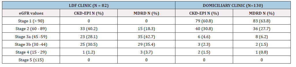 Table 2:Comparisons of Clinical CKD staging based on CKD-EPI and MDRD eGFR in Patients at LDF (N=82) and Domiciliary clinics (N=130).