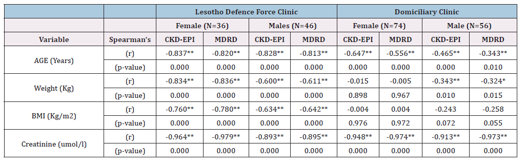 Table 3:Shows the Spearman’s correlation (bivariate analysis) of CKD-EPI and MDRD eGFR based on age, weight, BMI and creatinine in HIV co-morbid HTN and DM patients at LDF and Domiciliary clinics. N= number of participants; r= Correlation Coefficient; CKD-EPI-Chronic Kidney Disease Epidemiology Collaboration; MDRD- Modification of Diet in Renal Disease