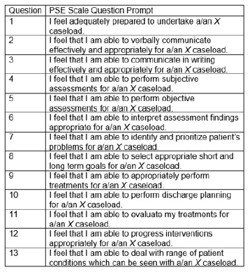 Figure 1:Physiotherapist Self-Efficacy Scale Questions. Note that “X” included the novel caseload type (orthopedic or neurological) based on enrolled course.