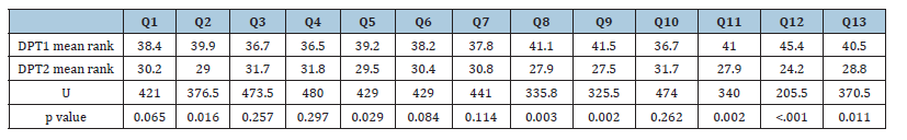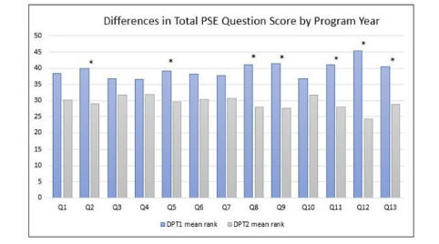 A Mann-Whitney U test was performed to explore differences in PSE question scores between DPT1 and DPT2 students. Table 4 & Figure 2 present the results of the Mann-Whitney U test, showing a statistically significant difference in scores between DPT1 and DPT2 students for questions 2, 5, 8, 9, 11, 12, and 13. There was no statistically significant difference in scores between DPT1 and DPT2 students for questions 1, 3, 4, 6, 7, and 10.