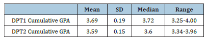 Abbreviations: GPA=grade point average; SD=standard deviation; DPT1=first-year physical therapy students; DPT2=second-year physical therapy students.