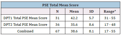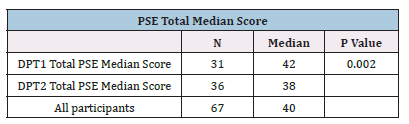 Descriptive statistics for total PSE mean score by program year show a higher range though lower mean score for DPT2 students, as shown in Table 2. The median PSE total score was statistically significantly higher for DPT1 students (42) than for DPT 2 students (38), U=313.5, p=.002, as shown in Table 3. For overall PSE questionnaire score, first-year PT students reported significantly higher case management self-efficacy compared to second-year PT students.