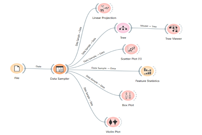 The machine learning analysis of the ore survey is carried out using the python associated ORANGE machine learning software. The flow chart of the machine learning analysis is done as furnished in the following sequence involving feeding the survey data as compatible file to the data sampler and then to various models of the software (Figure 1). Data sampler takes certain percentage of the fed data as the sampling and labeling by classifications and remaining data as test data. Linear projection to project the ore densities with concerned sectors, the tree viewer model is capable of achieving the decision tree AI and ML algorithm of various sectors analyzed. Scatter plotter identifies the degree of ore density scattering in the test region. Statistical analysis give rise to percentile variations of the ore densities in terms of classifications as well as quantifications. Box plot and violin plots furnish the probabilistic quantification of classified ore densities as a pictorial form.