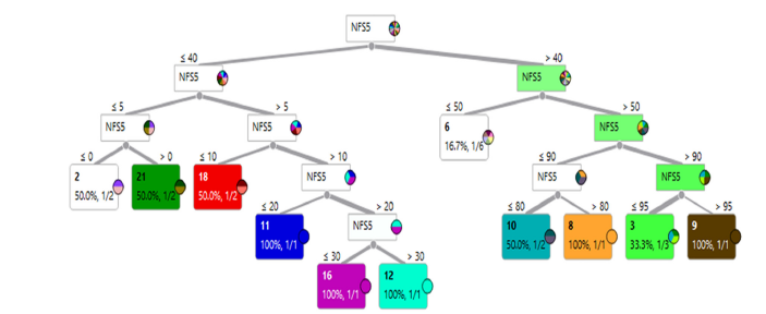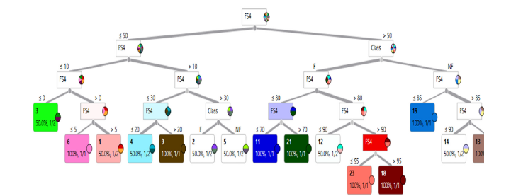 Figure 6 represents the decision tree AI and ML algorithm of machine learning test run when FS5 is taken as target parameter and NFS5 is taken as featured parameter. It reveals that the sector is divide into two namely one as less than or equal to 40% nonferrous ore existence and second as more than 40% nonferrous ore existence. The prior connects to the sectors 12, 11, 18, and 21 for the sequential mining protocol of nonferrous ores. The later connects to sectors greater than 40% ore concentration leading to the mining protocol route as 9, 3, 8, 10 and 6 for nonferrous ore mining.