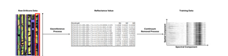 This extensive dataset of more than 1000km scanned drill core and 84,919 geochemical assay data provides information on various mineral deposit types, which is presented in Table 1. It includes iron oxide copper-gold (IOCG) deposits such as Olympic Dam, Prominent Hill, and Carrapateena, driven by hydrothermal and tectonic activity. The dataset also covers a range of gold deposits, with orogenic types linked to mountain-building and alluvial/placer types resulting from weathering and sedimentation. Uranium deposits in the dataset span roll front, sandstone-hosted, and IOCG-related sources. Iron ore deposits feature Banded Iron Formations (BIFs) from the Middleback Ranges and iron skarns from contact metamorphism. Additionally, the dataset details zinclead- silver deposits of the Volcanic-Hosted Massive Sulfide (VHMS) type, like those at the Angas Zinc Mine (Geoscience Australia, 2023).