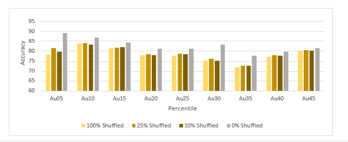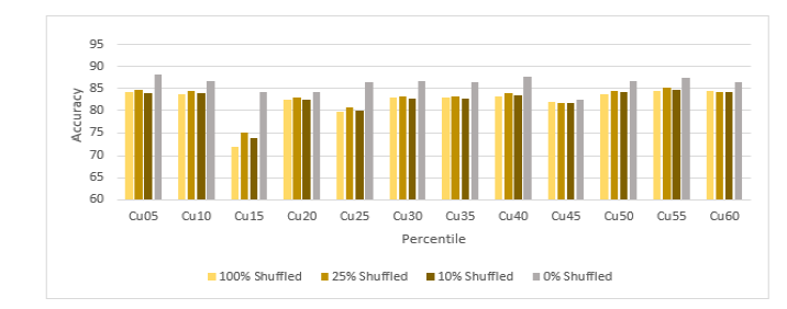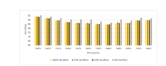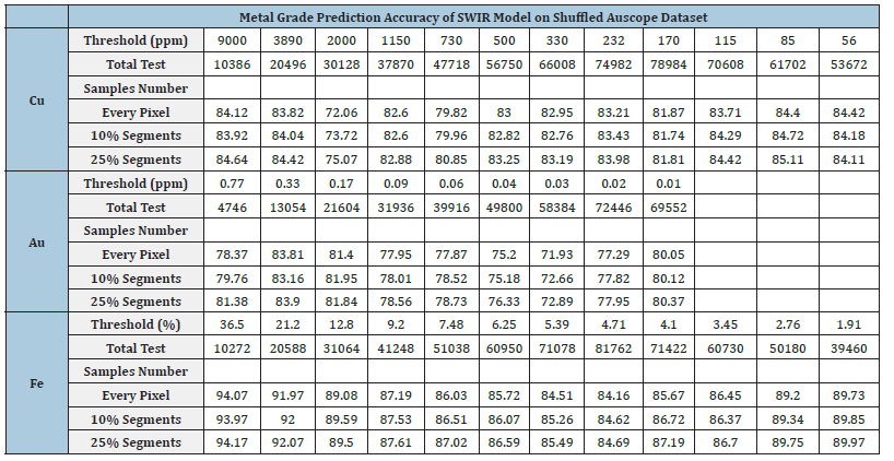 sComparison between non-shuffled data testing result and shuffled data testing result: We used the accuracy of metal grade prediction from the SWIR model from the first test as the benchmark to verify the effect of shuffling along the spatial axis. Figure 9-11 show the comparison results. The non-shuffled data testing result has the highest prediction accuracy on average 5% more accurate than the shuffled data testing results for all three metals. The prediction accuracy for all types of shuffled data test results is extremely close, and 25% shuffled has the highest accuracy and overall pixel shuffled data has the lowest accuracy. Hence, we can conclude while there is a spatial relationship for each data cube of a drill core the CoreSmart2 neural network is also predicting spatially different located spectral similar features in the data cube but with slightly lower accuracy.