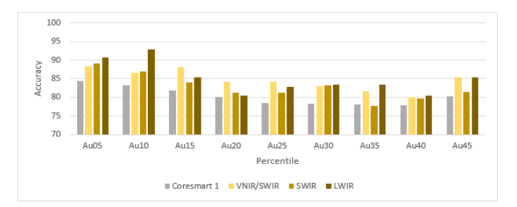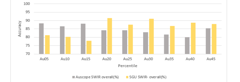 Figure 4:The prediction accuracy (%) of gold for CoreSmart1 compared to VNIR/SWIR, SWIR and LWIR models.