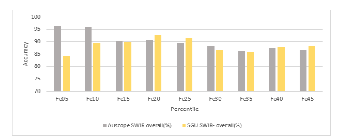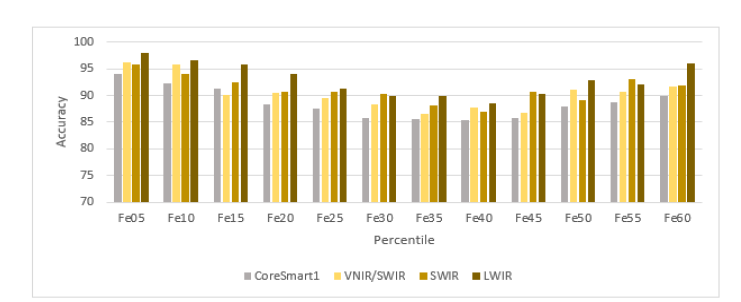 Figure 5:The prediction Accuracy (%) of iron for CoreSmart1 compared to VNIR/SWIR, SWIR and LWIR models.