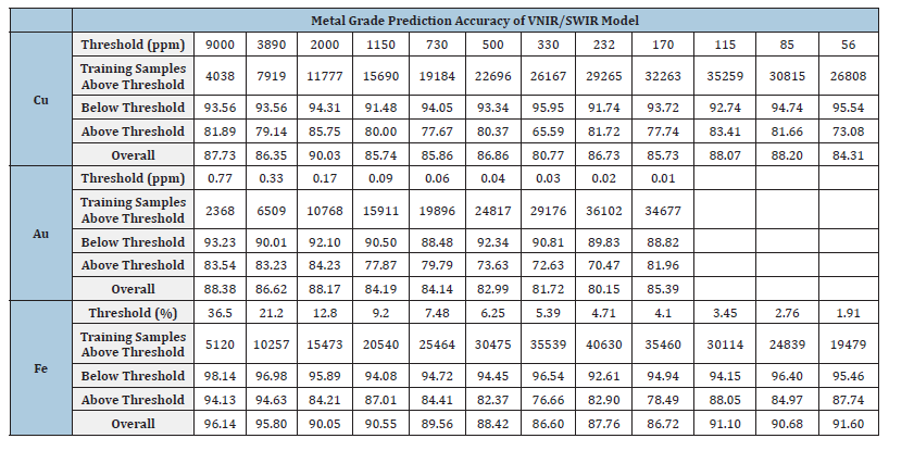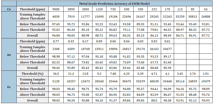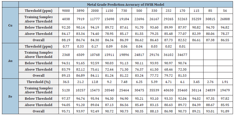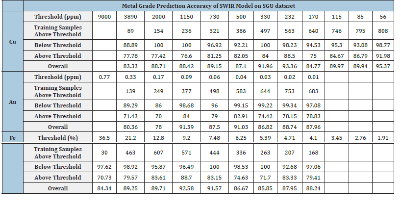 Table 7:Metal grade prediction accuracy of SWIR Model, shown is the accuracy of correct identification below and above the threshold in percent.