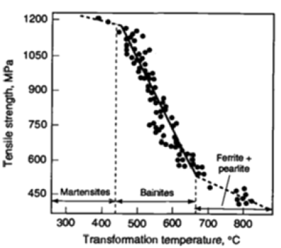 Figure 1:Relationship between tensile strength (in MPa) and transformation temperature (in °C) of ferriticpearlitic, bainitic, and martensitic steels [7].