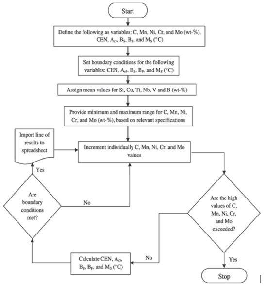 The various calculations associated with this metallurgical and mathematical modeling can be performed using either a scientific calculator, commercially available Microsoft Excel or similar software, or a suitably designed computer software program. Figure 2 shows a typical flowchart [17,18] that can be used to identify electrode or weld metal compositions with desired minimum and maximum ranges of limits as detailed in the boundary conditions for various elements within the relevant electrode specification [4,5] and the boundary conditions for desired CMCs of weld metal. Additionally, the flowchart allows one to assign mean values for selected elements such as Ti, Al and O besides Si, Cu, Nb, V, B that are considered vital for promoting specific types of microstructures, even though Ti, Al, and O elements do not appear in Eqs. (1)-(8) for calculating relevant CMCs.