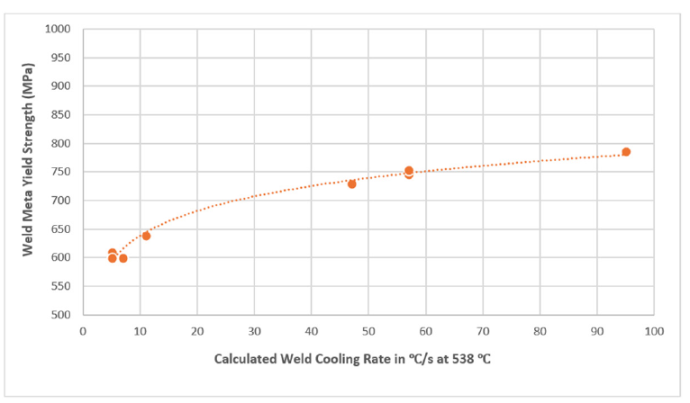 Weld metal yield strength (in MPa)=542.6×(Calculated weld cooling rate at 538 ∘C)0.0925 (Equation 9)
