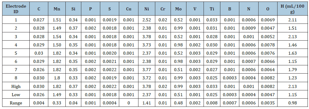These 8 bare solid wire electrodes were based on a 23 Taguchi design. The 23 Taguchi design varied the contents of only three principal alloy elements, viz., Manganese, Nickel, and Molybdenum, each at 2 levels, one “high” and the other “low,” while keeping all other elements at a fairly constant level. Vacuum Induction Melting (VIM) was used to produce various billets corresponding to the 8 bare solid wire electrode manufacturing, all in one-go [21], thus eliminating conventional “trial-and-error” methods. Use of VIM limited the total gas content much below 500 ppm and eliminated any adverse effect of gaseous elements on weld metal toughness. The resulting weld metals showed a predominantly low-Carbon bainitic microstructure [22] that was also insensitive to HIC.