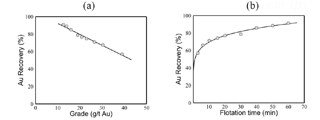 Figure 1:Illustrates the results of one of our bulk flotation experiments, where the particle size was K80=146μm and we used it as a collector at a concentration of 225g PAX per ton of ore. Panel (a) shows the relationship between gold (Au) grade and Au recovery, while panel (b) depicts Au recovery as a function of flotation time. The solid line in the panels represents our model, referred to as 28.1554 t*f 0.1+83.4051t*f 0.2 -21.0268 t*f 0.3. In our model, the dimensionless flotation time, denoted by tf*, was defined as tf./tref, where tref=60min. Flotation kinetics are slow and a long flotation time is required to achieve these goals.