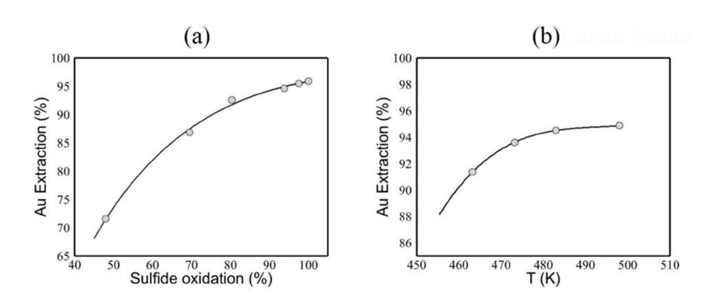 Figure 2:Shows the results of the POX tests. (a) illustrates the relationship between sulfide oxidation and gold (Au) extraction. The solid line represents our proposed model, which is referred to as -2855.35So 0.10 +5503.91So 0.20- 2910.54So 0.25. (b) shows the extraction of gold as a function of POX temperature, with the solid line indicating the predictions made by our reactive granular metamaterial [5].