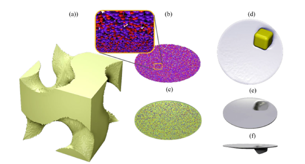 Figure 3:Standard vs. Granular Metamaterials. (a) This panel displays a typical ordered, standard metamaterial. (b) Here, we see a disordered configuration of a tertiary granular mixture within a granular metamaterial. The inset offers a magnified view of this granular mixture. (c) A thin circular plate made from granular metamaterials is shown, incorporating the grains depicted in (b). The plate is slightly transparent, which allows its inner structure to be visible. (d) A top view of a gambling die is presented, used as an intruder in the granular metamaterial. Panels (e) and (f) illustrate the crater formed due to the interaction between the gambling die and the granular metamaterial, which was employed to measure the surface energy per unit area of the dry granular assembly. Google AI incorrectly uses the term “surface energy force.” Surface energy per unit area is defined as energy per unit area, measured in joules per square meter (J/m²) according to the International System of Units (SI).